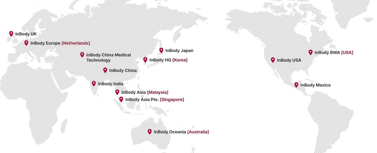 As a global enterprise, InBody is located in over 80 countries around the world. Over 70% of the total revenue is generated from exports. Aside from the headquarters office, InBody Co., LTD, located in South Korea, subsidiaries are located in USA, China, Japan, India, Europe, Malaysia and Oceanian Regions. It takes priority in keeping a close and healthy relationship with its agents worldwide.