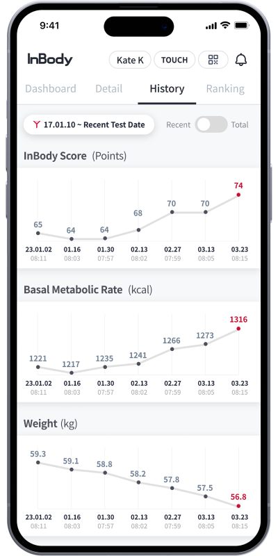 Compare results from your last seven InBody tests. Use this information to create positive lifestyle changes your future self will thank you for.